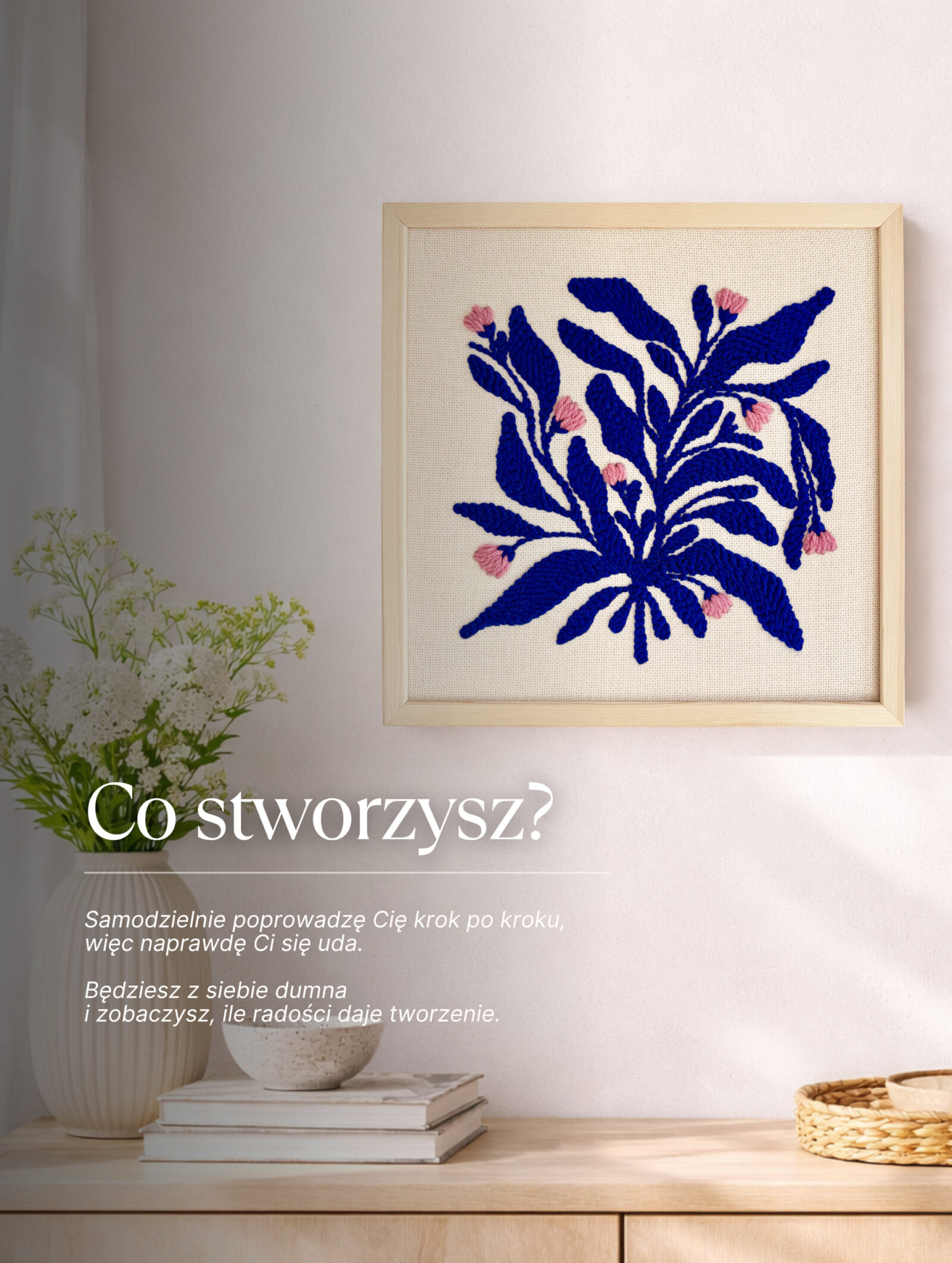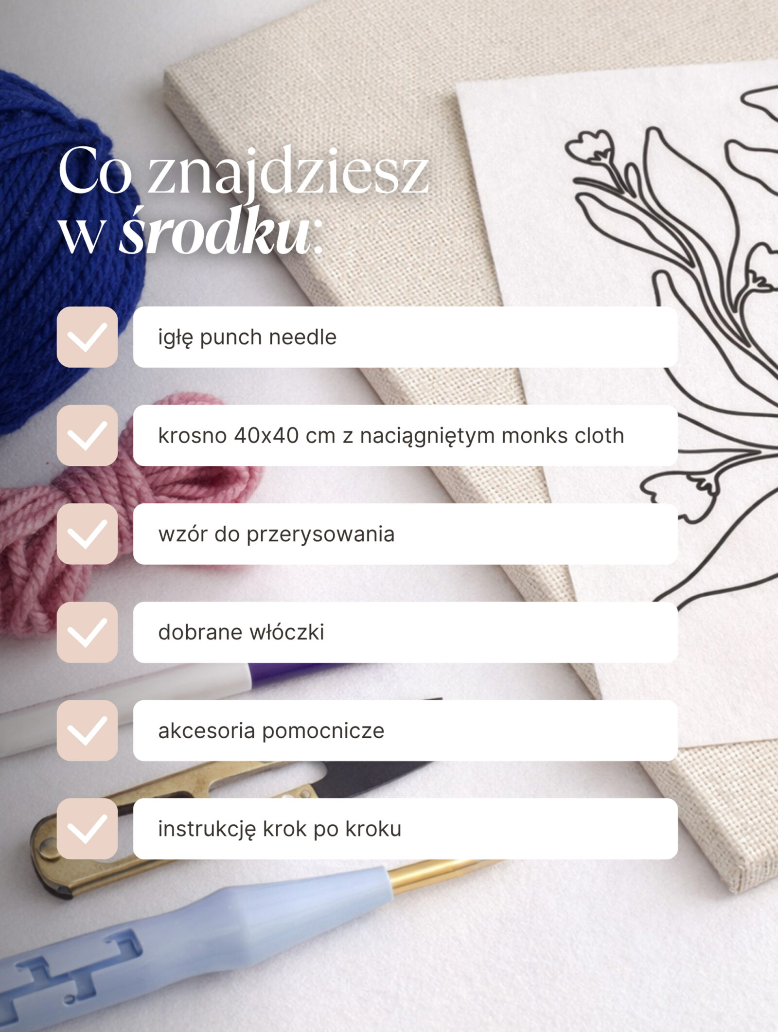 • E-booka z instrukcją krok po kroku — przejrzysty przewodnik, dzięki któremu zrobisz samodzielnie swój pierwszy obraz punch needle (ze zdjęciami i praktycznymi wskazówkami).